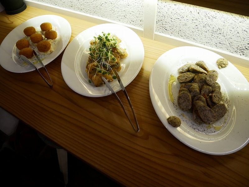 サラダ、サルシッチャ、サフランライスのコロッケ、エスカベッシュ、ポテトフライ、
