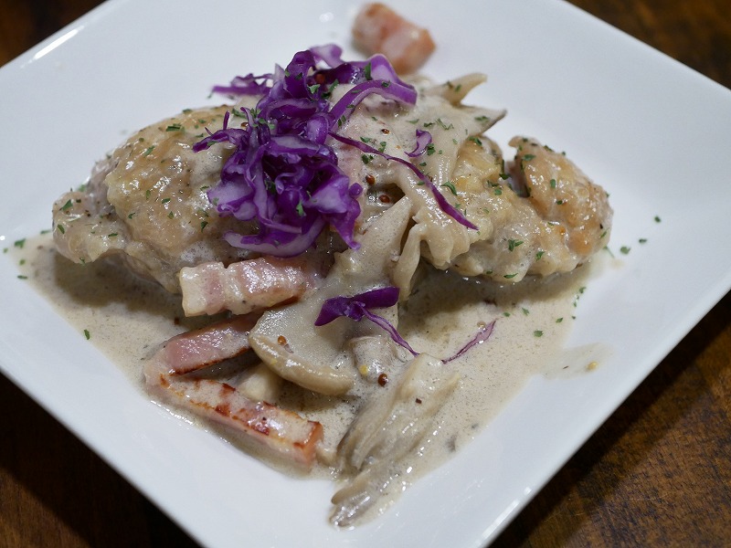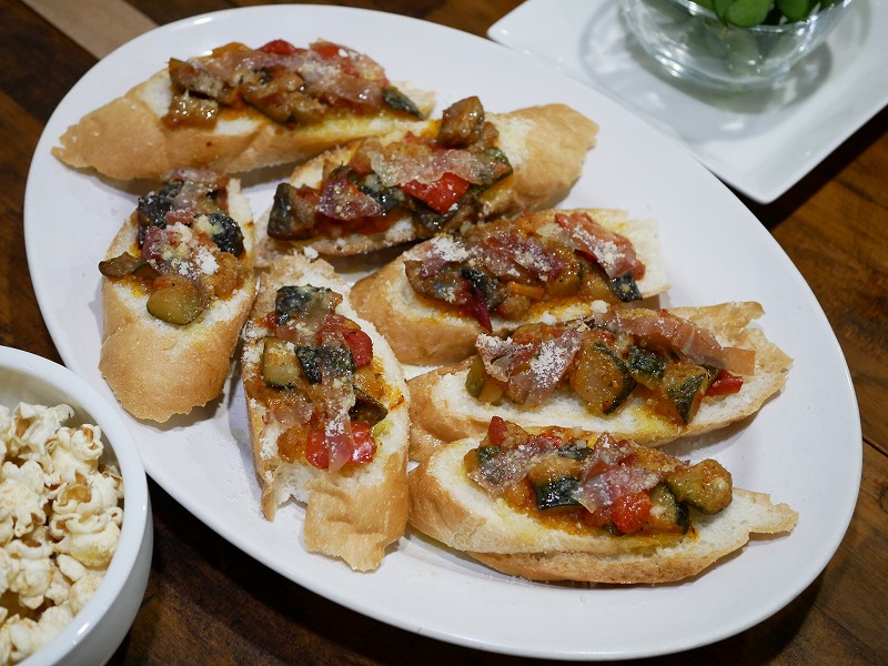 カナッペ的なヤツ(!)、枝豆、ポップコーン、メインはきのこ風味のチキンフリカッセ、