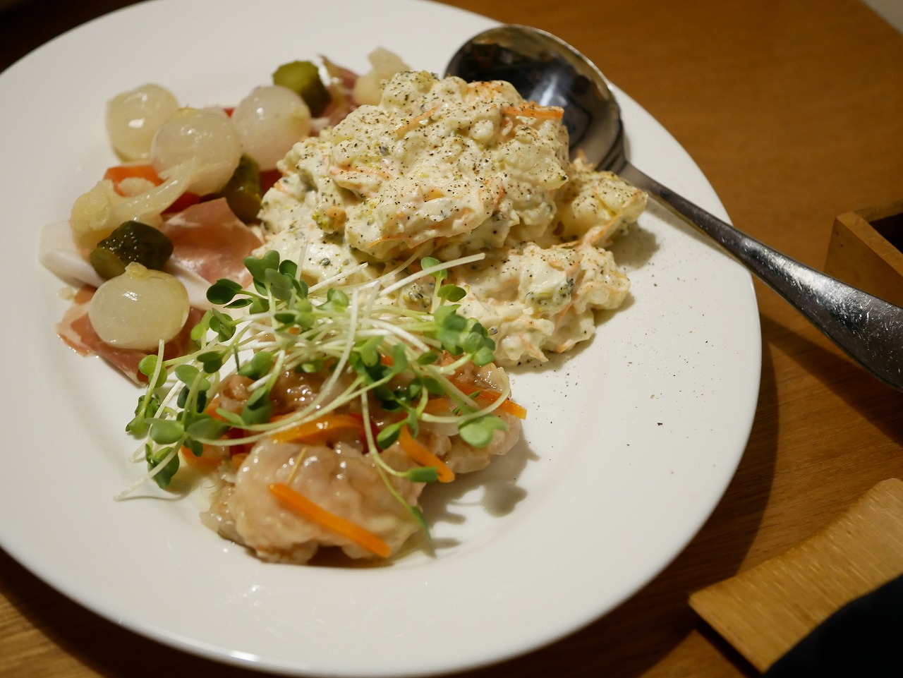 ピクルスと生ハム、ポテトサラダ、エスカベッシュ