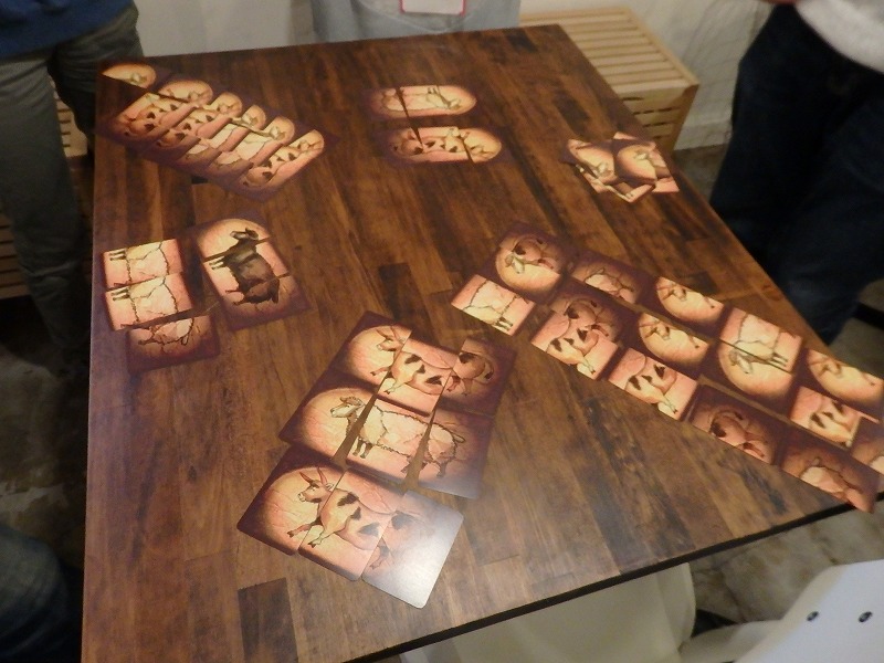 無作為に場に出していきます。プレイヤーはそれを、絵として完成できるような順番で拾うか、