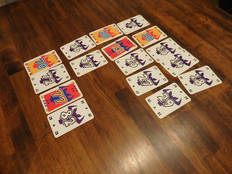 場に出された4つの列に手札を並べていきます。並べるときは、