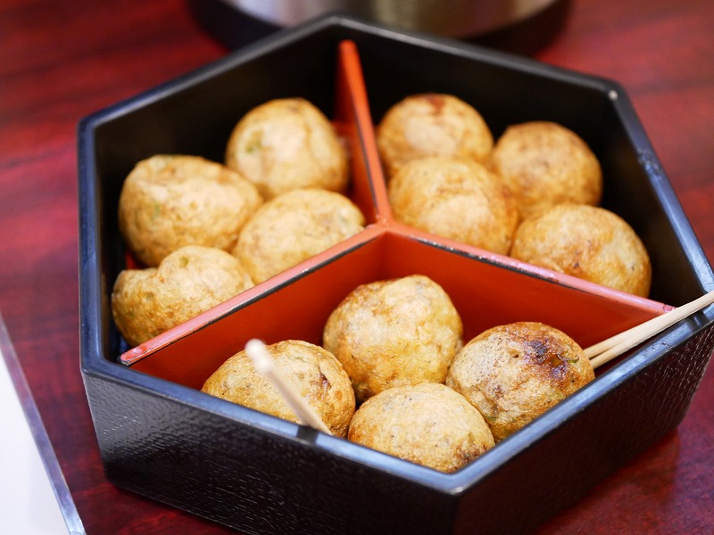 こちらのたこ焼きはちんまりサイズ、初めから入っているお出汁の味で食べるスタイルで、
