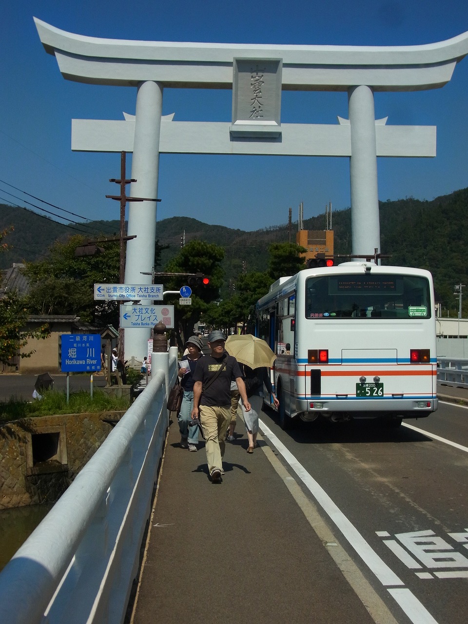 30分ほど待ち、到着したバスに乗って出雲大社のちょっと手前、吉兆館前バス停へ向かいます。今回のお参りのスタート地点、宇迦橋の大鳥居の最寄のバス停です。