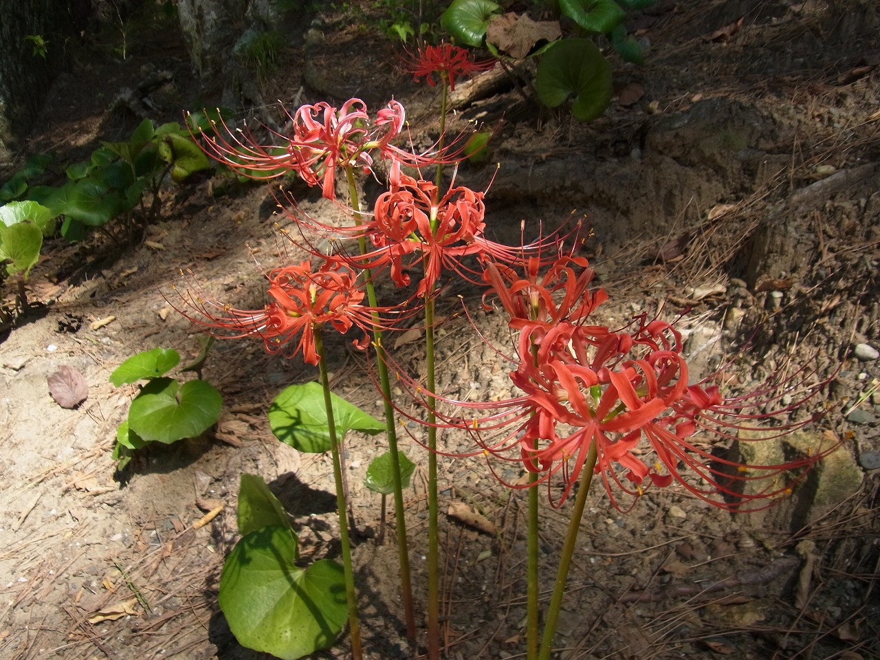 <松の並木の緑と、彼岸花の赤が参道を彩ります>