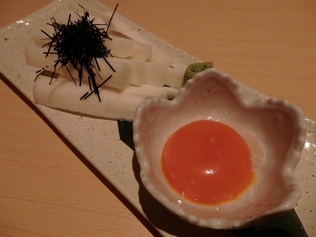 醤油をたらして、わさびを乗っけて、黄身をトローリつけてしゃくっといけば、
