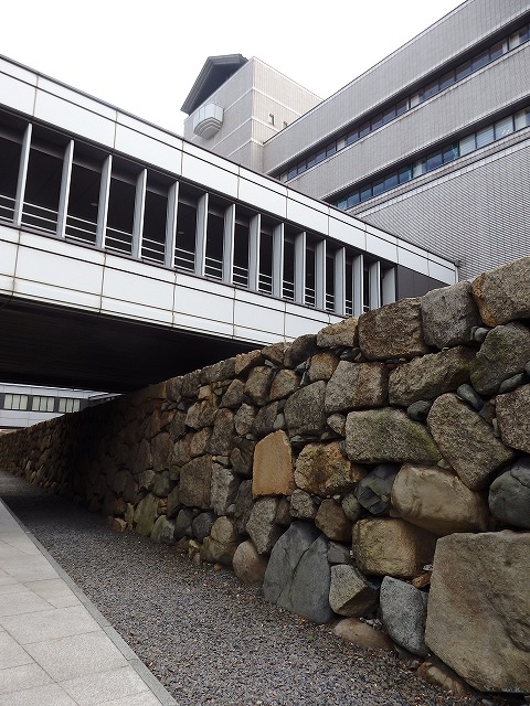 石垣と現代の建物(レグザムホール)が交錯する様子を楽しみつつ、