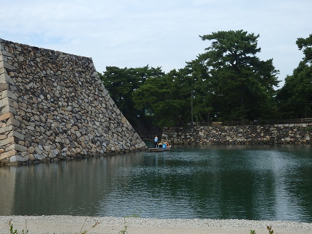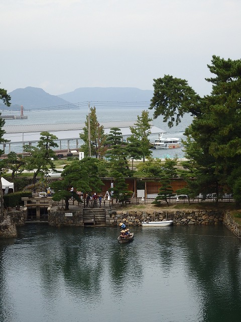 天守跡の石段を登ると、お堀に浮かぶ城舟と、海に浮かぶ現代の船のコラボが楽しめます。
