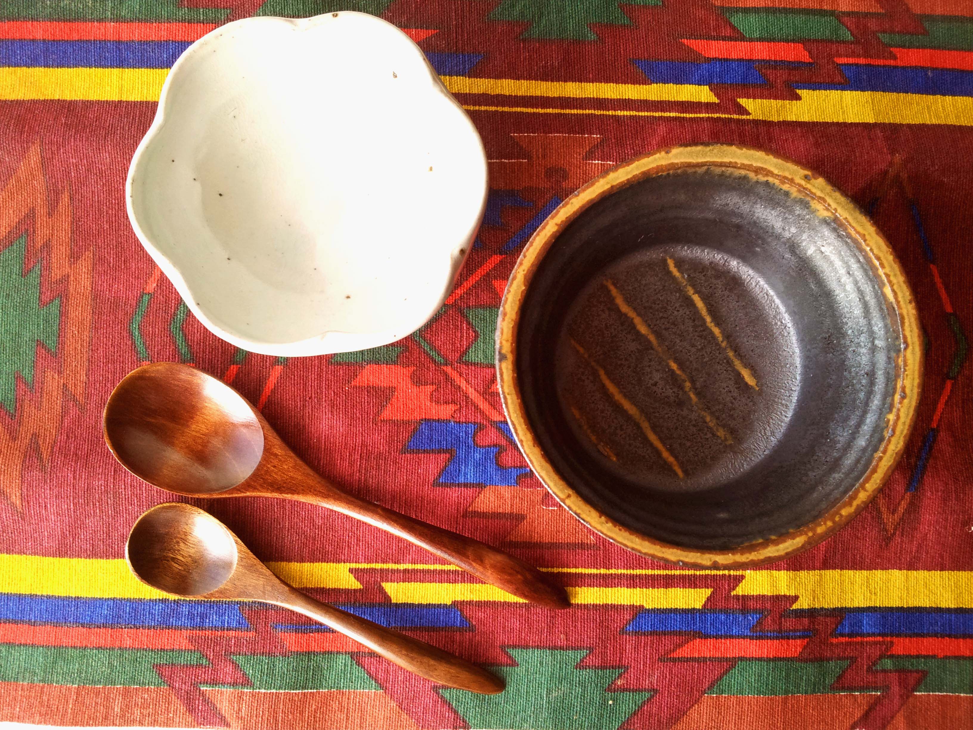 <八田亨さん作の花形小鉢+江口香澄さん作の黒い小鉢+作者忘れた(ぉ)塗り物の匙>