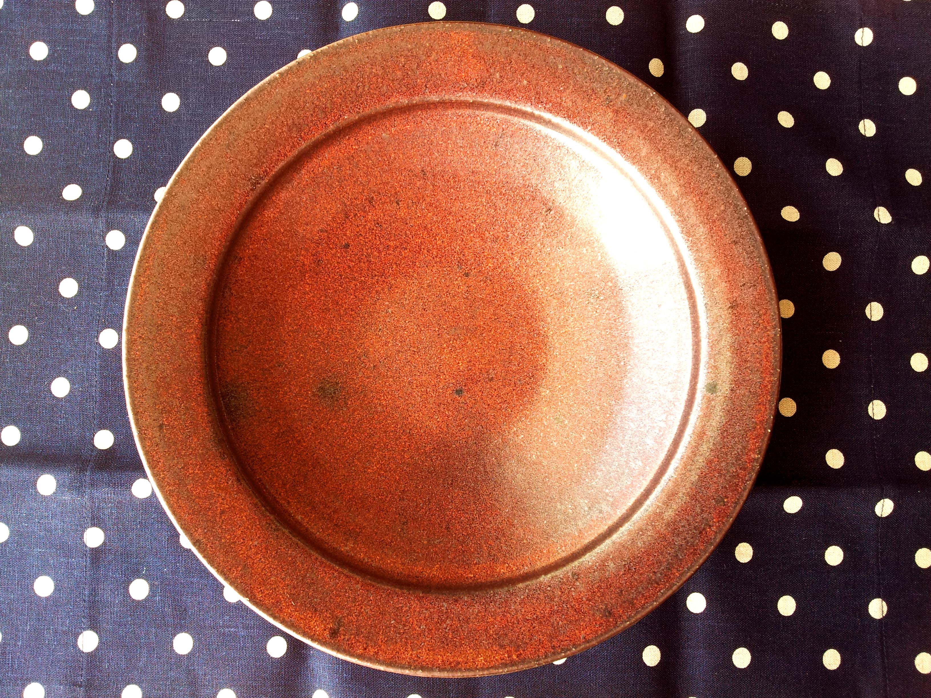 赤い大きな皿の上に少し黒いしみがあり、太陽を連想しました。