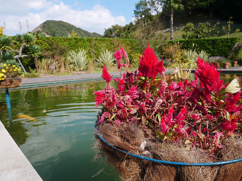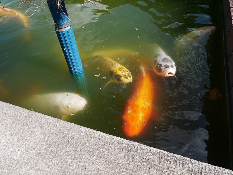 <綺麗なお花と、鯉たちがお出迎え>