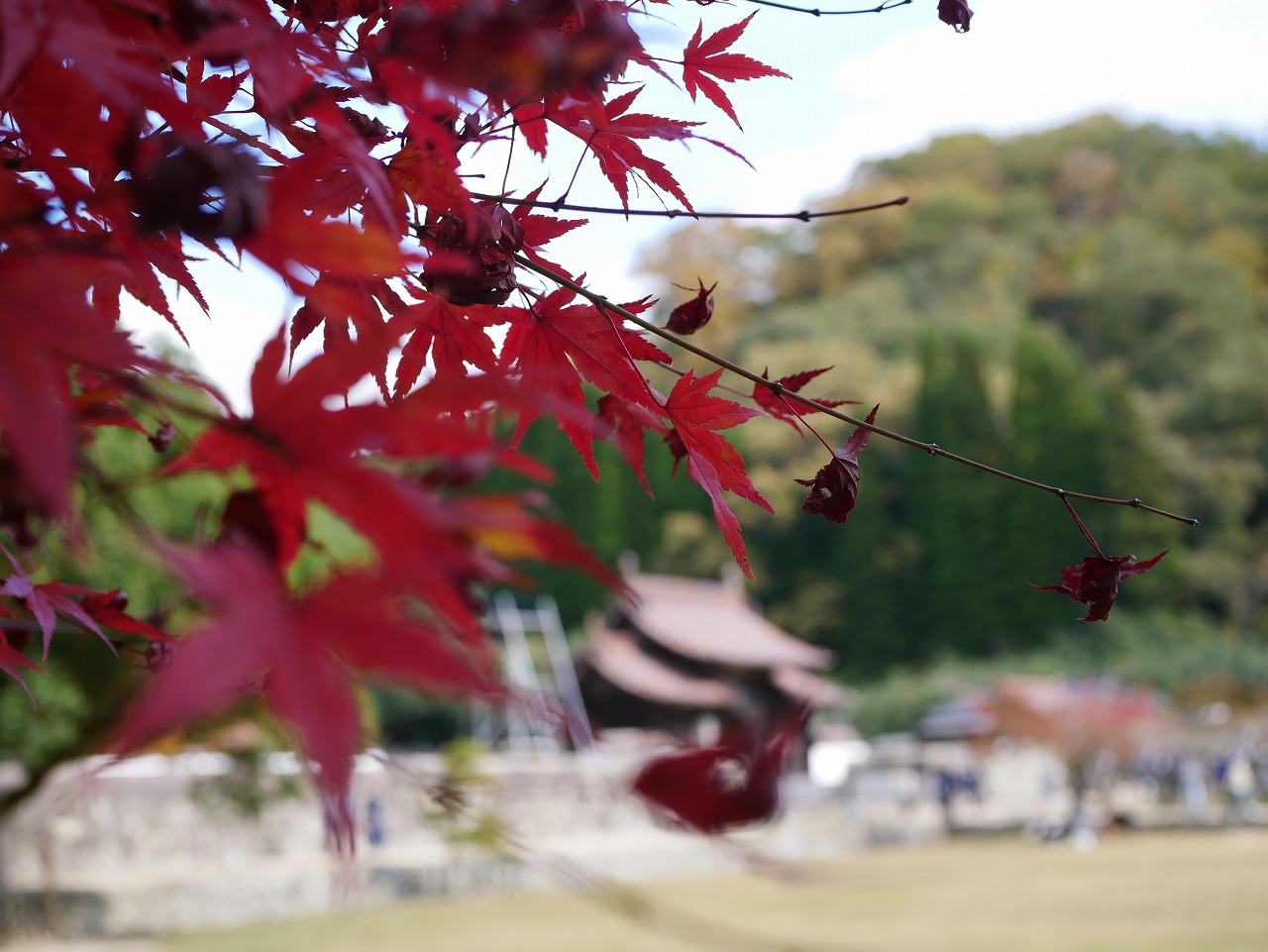 閑谷学校の紅葉は葉っぱが小さめで、空にスプレーを撒いたように見えるのが何とも素敵です!