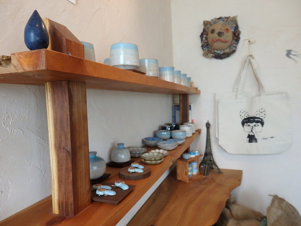 岡山の陶芸家、横山黄世さんのうつわがずらりと並びます。