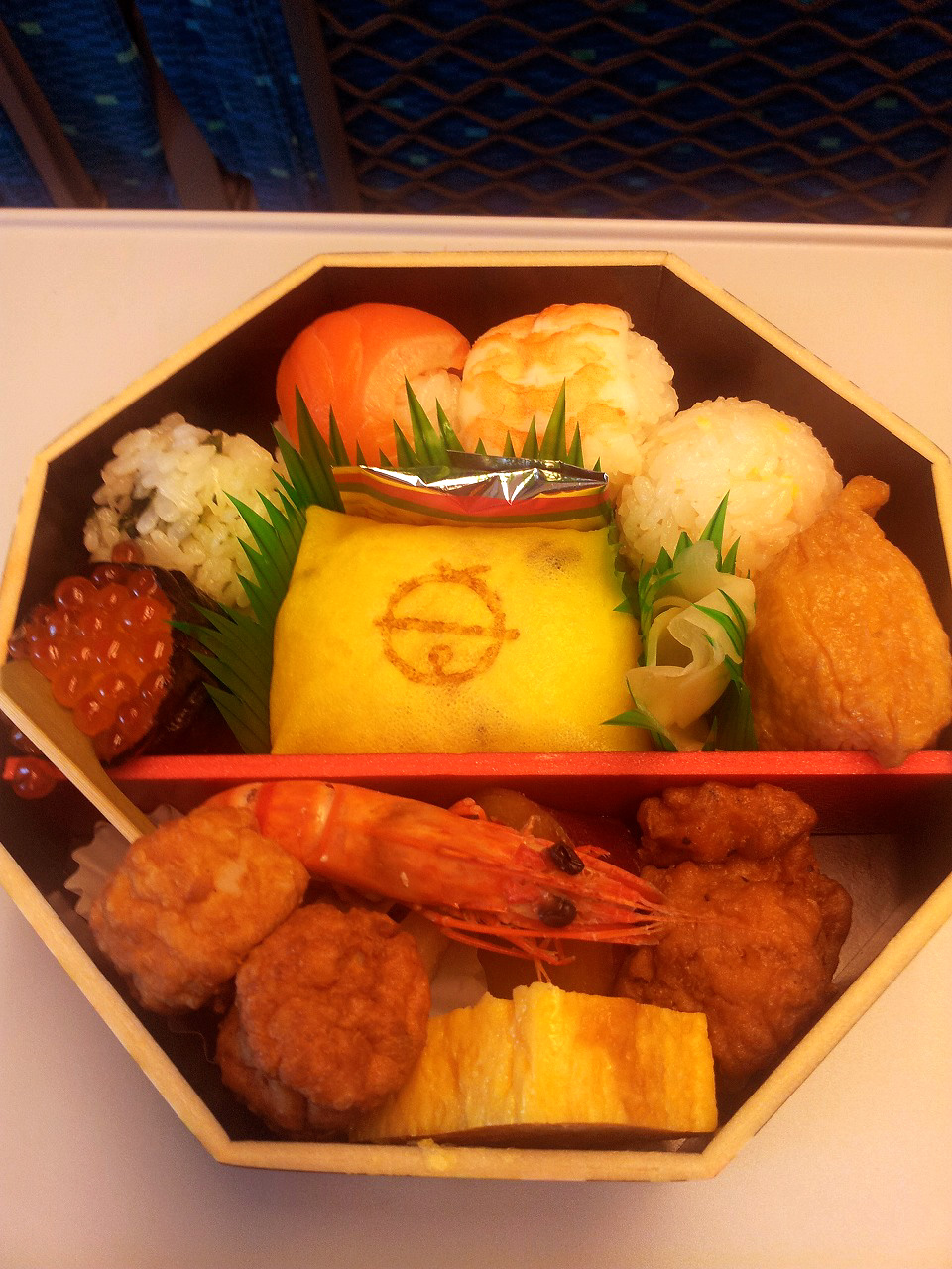 コロコロの鞠寿司の可愛らしさ、おかずの中央にある海老のゴージャスさが嬉しい、