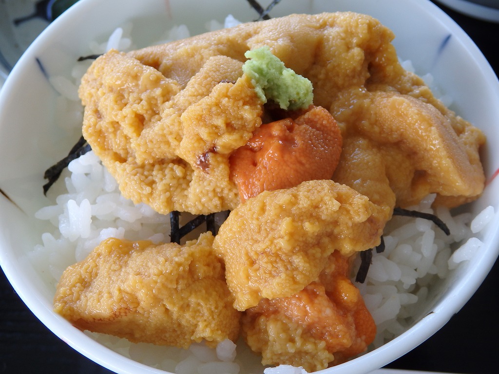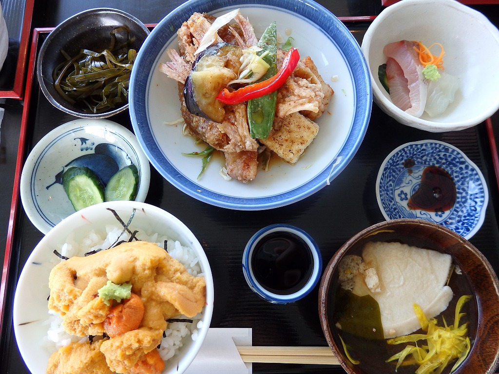 この日は、お店の看板メニューであるえびす浜膳の白飯を、ミニ生うに丼に変えた、