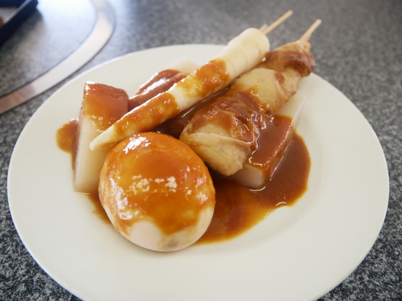 500円でこんにゃく2枚、ちくわ、さつま揚げ、姫竹、大根、卵と具だくさん。