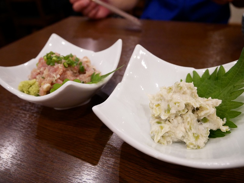 <鯵のなめろう、わさび漬け>