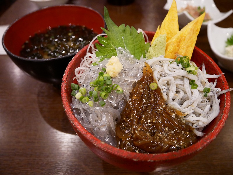 釜揚げ、生、ちょっと珍しい?沖漬けのしらすがたっぷり乗ったどんぶり!