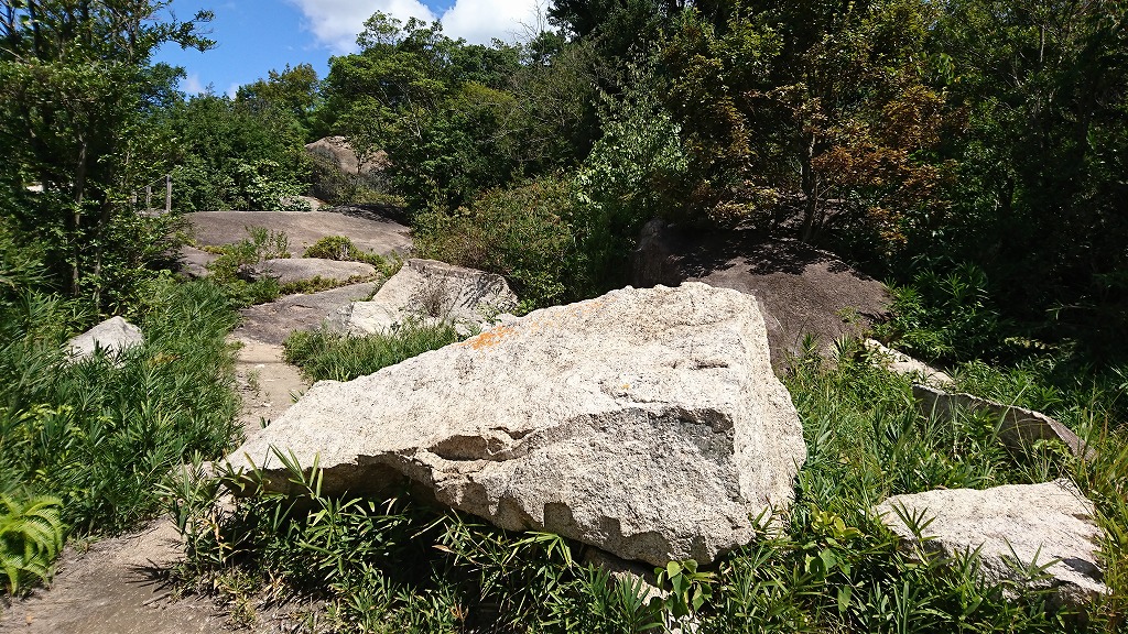 途中には大阪城のための石切り場跡地があります。松江藩の紋が入った石もある?