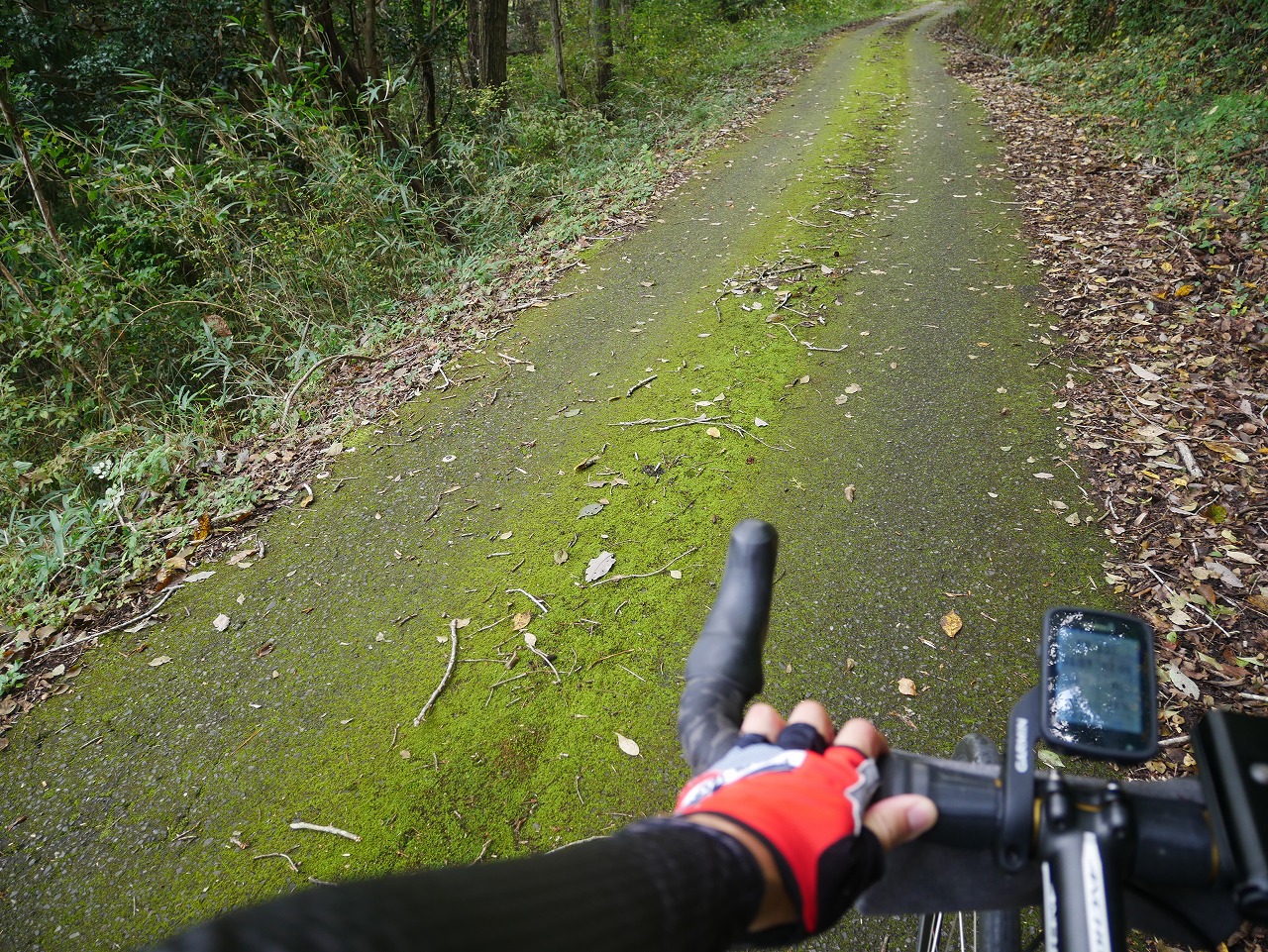 滑って転びそうな苔の道、こんなところで落車して怪我してもつまらないですしね。