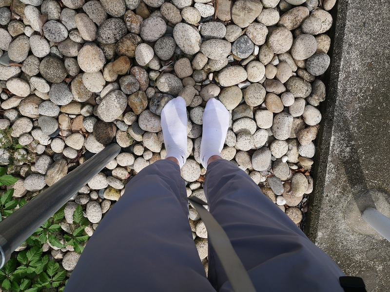 本和気駅には、丸い石ころを敷き詰めた上をあるく、