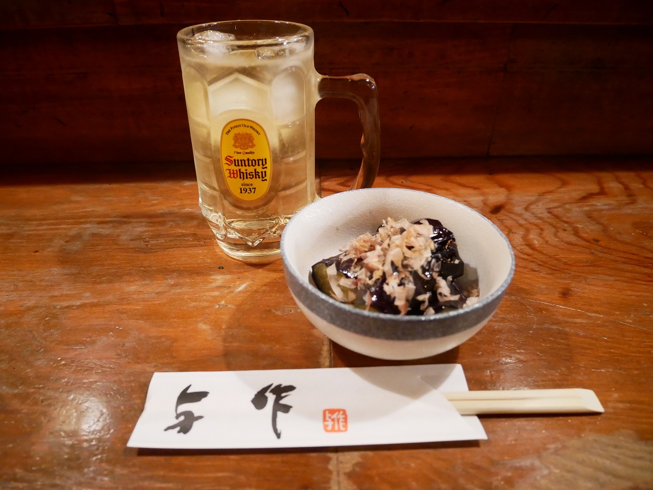 お通しは茄子の揚げびたし。トロットロのなすにちょい濃いめの出汁が染みこんで酒が進む!