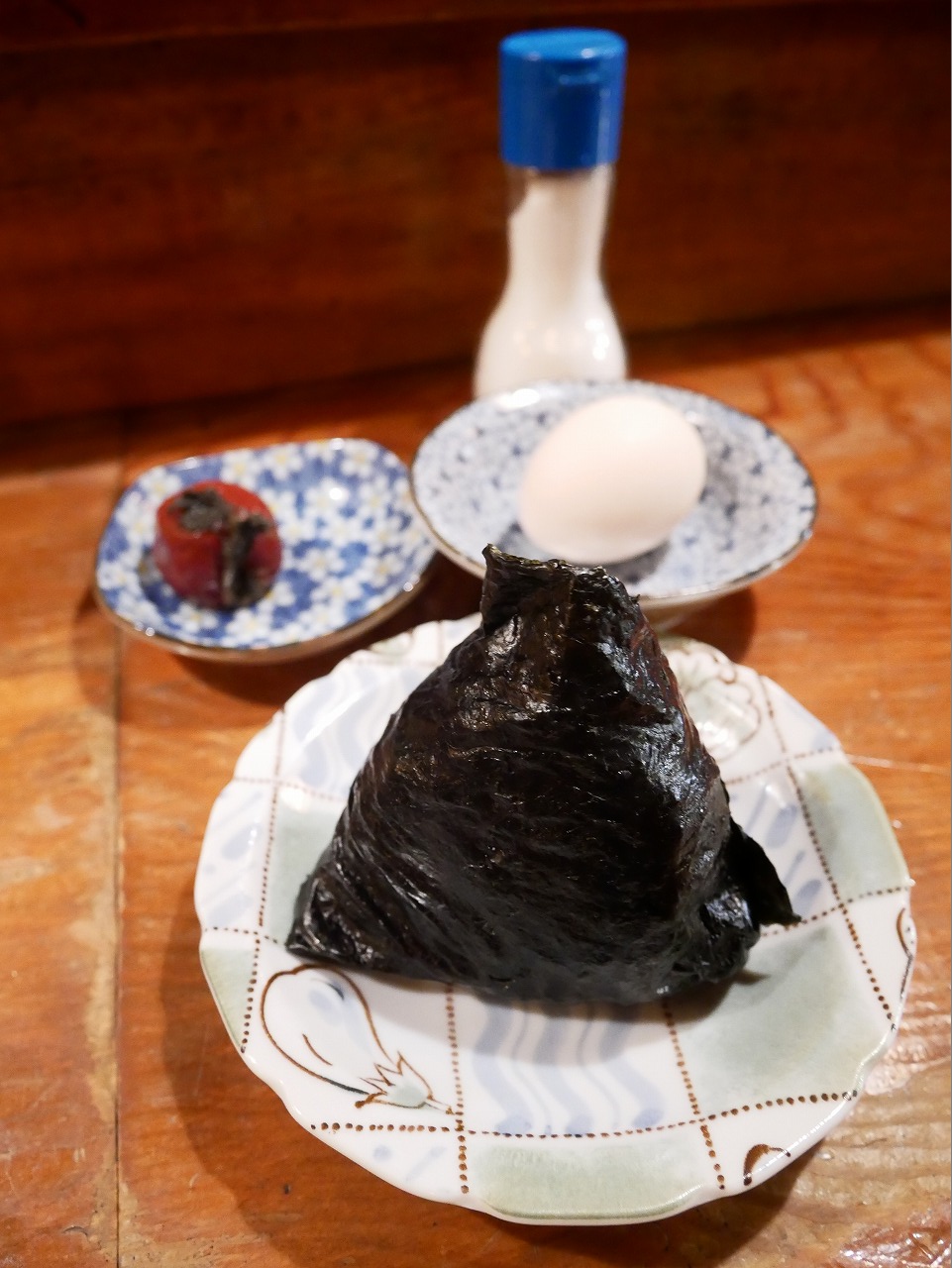 〆にご飯ものをと言ったら、おむすび、自家製梅干し、ゆで卵をサービスしてくれました(*´з`)
