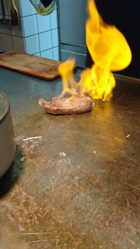 フランベの炎も赤々と、流れるような手さばきで焼き上がるステーキと野菜たち。