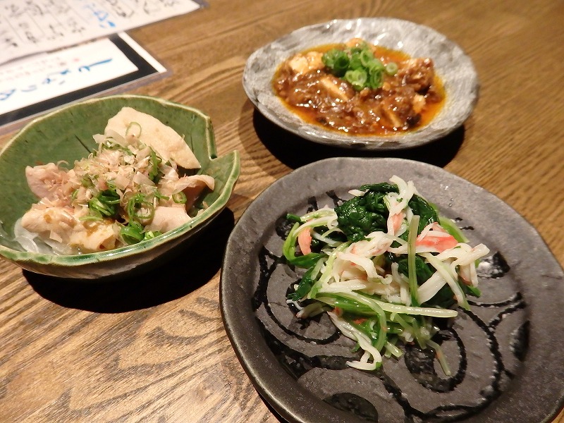 <お通し左から:豚もつぽん酢、辛口麻婆豆腐、青菜とカニカマの和え物>