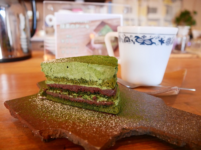 渋い色味とほろ苦さが、まったりとした大人の午後を演出する抹茶のケーキ。