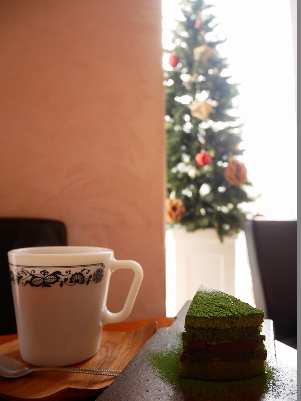 とはいえ、店先のツリーと瓜二つの抹茶のケーキをいただきつつ、