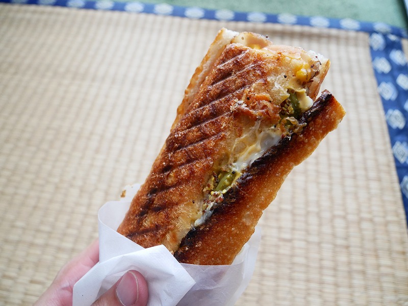 これらをパンで挟み、バターをたっぷり塗った2枚のアツアツ鉄板で挟んで焼きます。