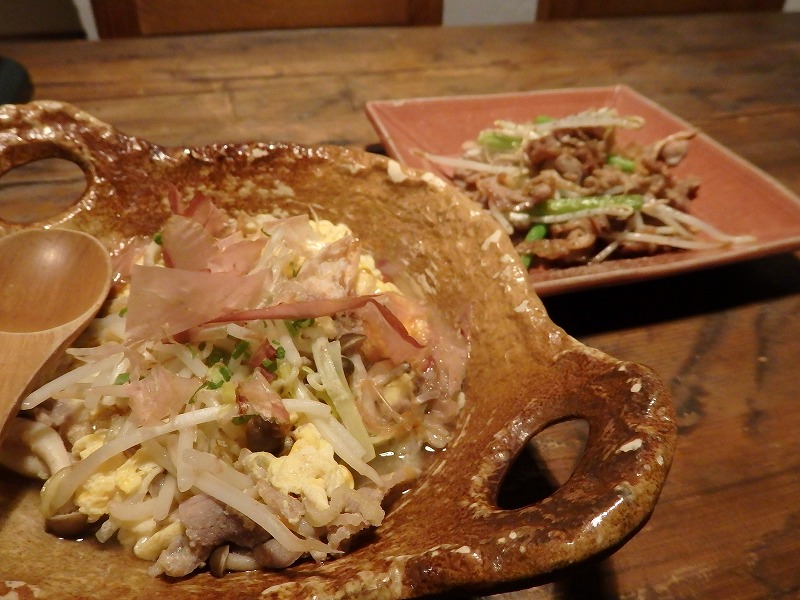 <吉備黄金鶏と黄にらの卵とじ、吉備黄金鶏のにんにく黒コショウ炒め>