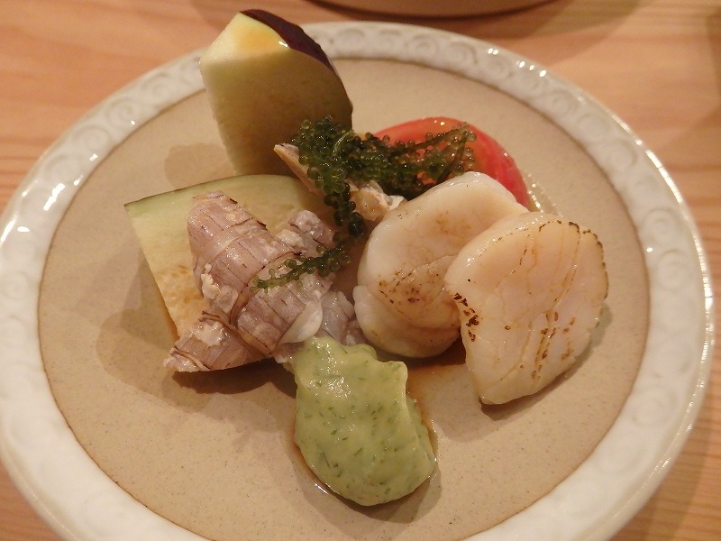 <酒肴コース:水茄子、トマトと蝦蛄、帆立のサラダ ハーブ白味噌添え>