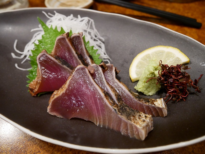 香ばしく炙られたかつおちゃんに、わさびと紅蓼チョンチョン、