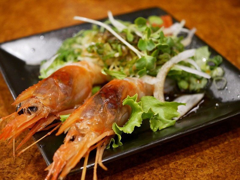 プリッとした海老の刺身の上に、山椒などの辛味が利いたタレがかかった看板メニュー。