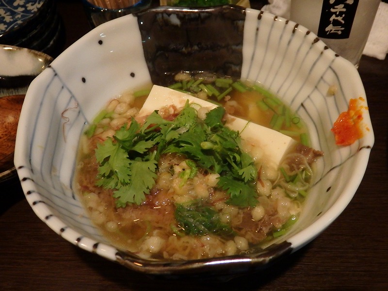 パクチーと共にいただく、出汁たっぷりの肉豆腐。