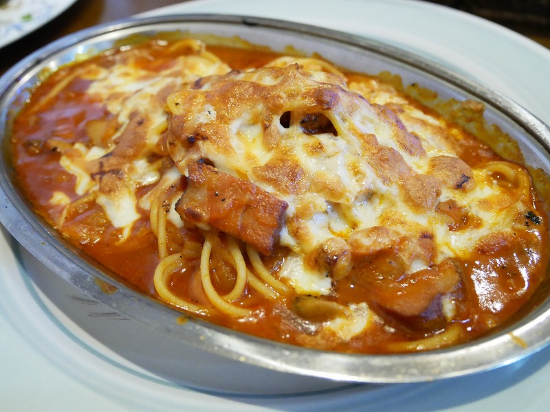 鶏肉やベーコンなどたっぷりお肉のトマトソースを絡めたスパゲティにチーズをのせ、