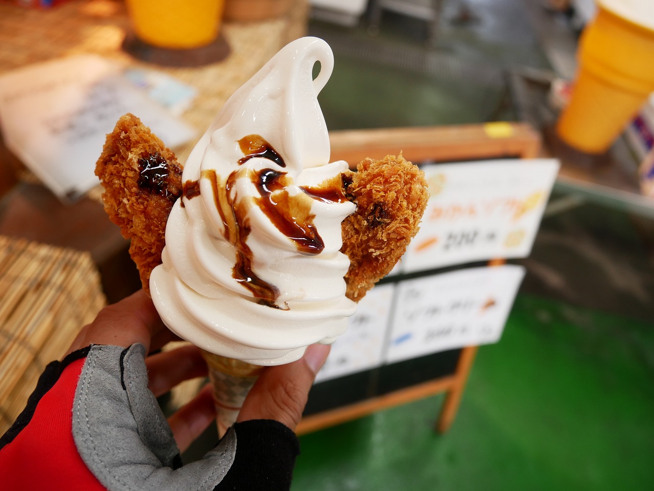 バニラソフトクリームの上にカキフライが2個。衝撃のビジュアルです。