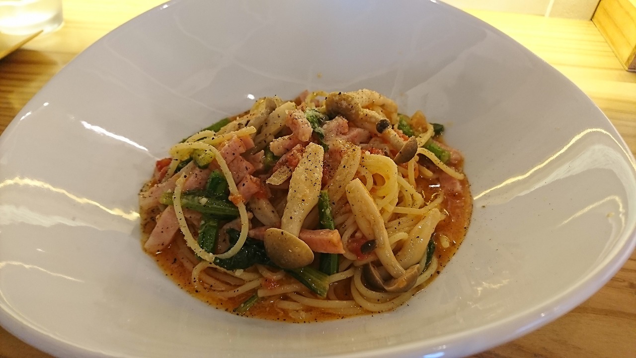 トマトの酸味、旨みにベーコンの塩気、アスパラ菜の食感とほろ苦さのバランスが良く