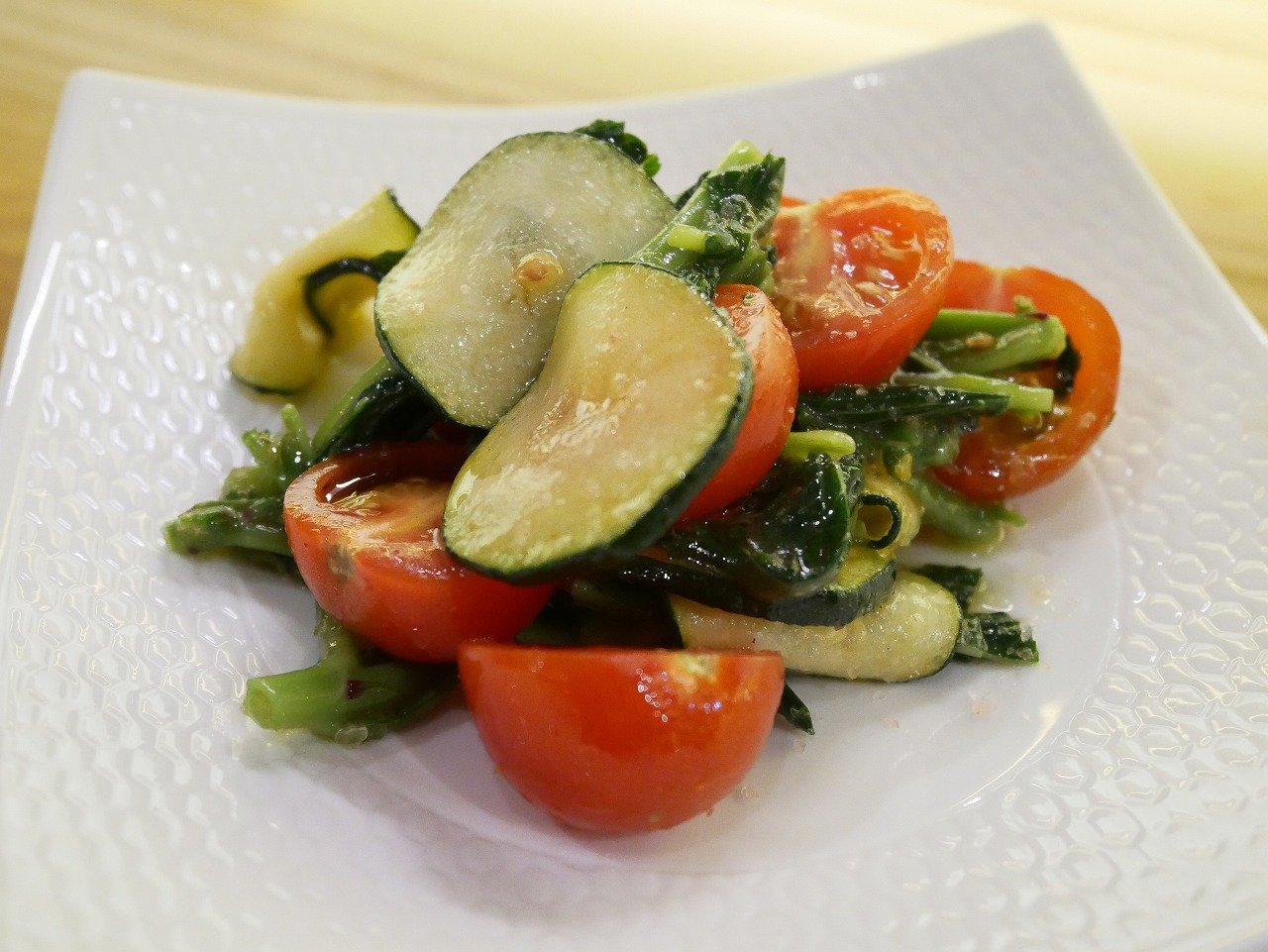 ズッキーニ、モロヘイヤ?プチトマトを塩味を利かせて炒めたものですね。