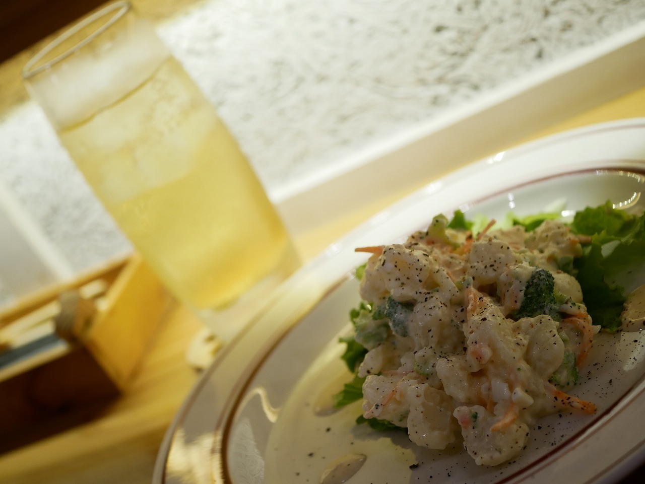 <晩酌セット(生ハムとチーズ豆腐のブルスケッタ、小盛フライドポテト、ハイボール)>