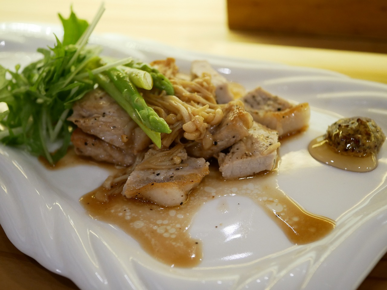 軽く塩コショーで味付け、添えてあるのは、バルサミコ酢?で炒めたえのきとマスタードかな?
