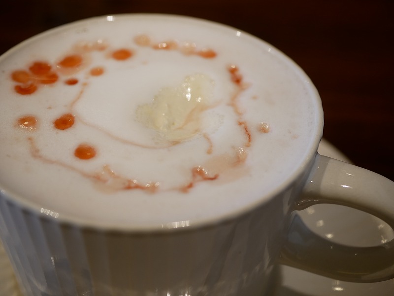 温かいいちごミルクの上に、生クリームが乗って何ともオシャレ。