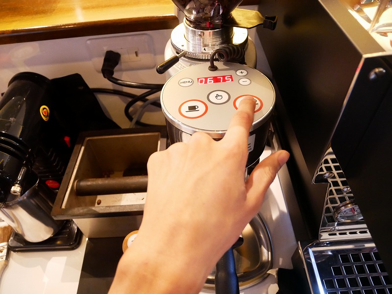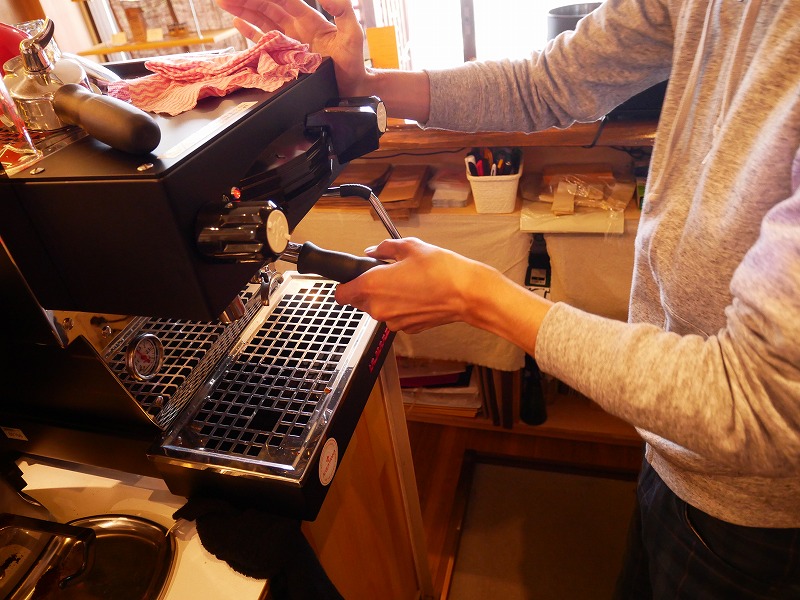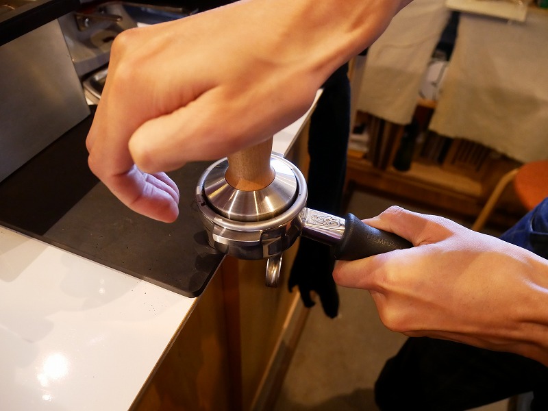 グラインドは2杯分で行い、タンピングしつつエスプレッソマシンを少し温めてからセット。