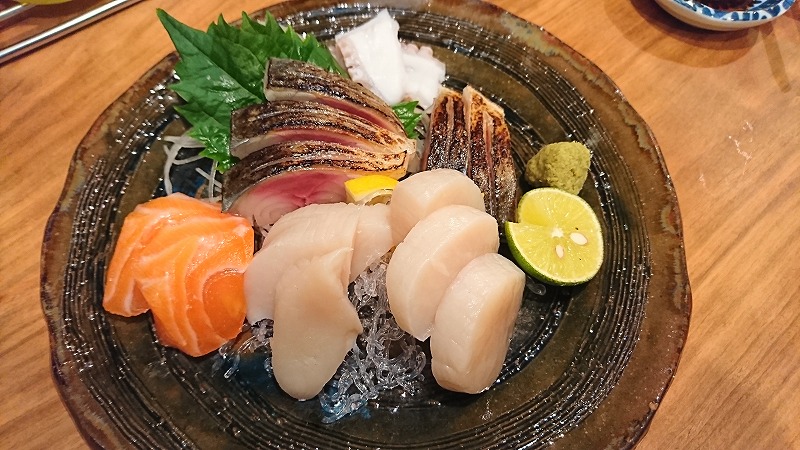 <蛸の唐揚げ、たいらぎ貝・金華サバのお刺身(