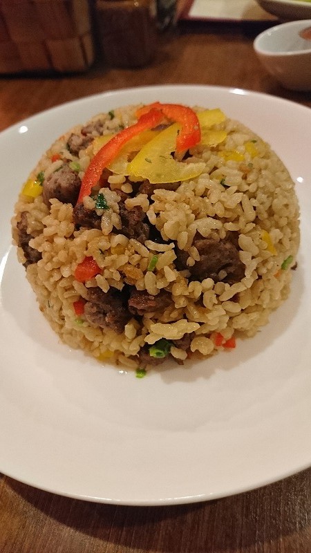 ペルー風チャーハンは牛肉?のそぼろがたっぷり入り、醤油の香りが利いた日本人好みな味。