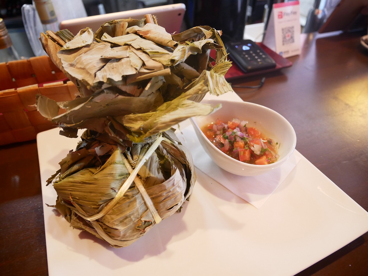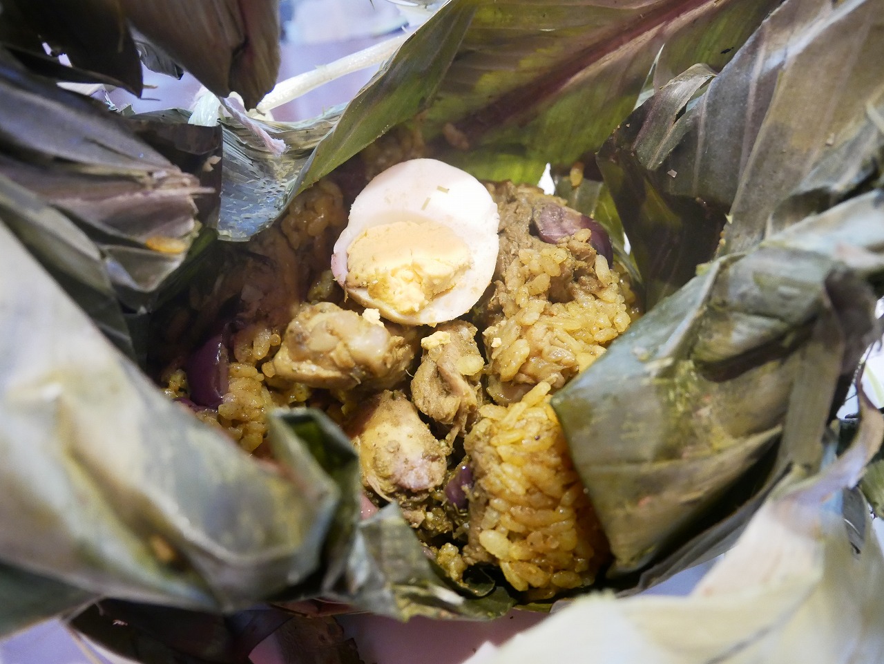 チキンやライスを包み、蒸しあげたお料理で、日本でいうところのちまきのようなお料理。